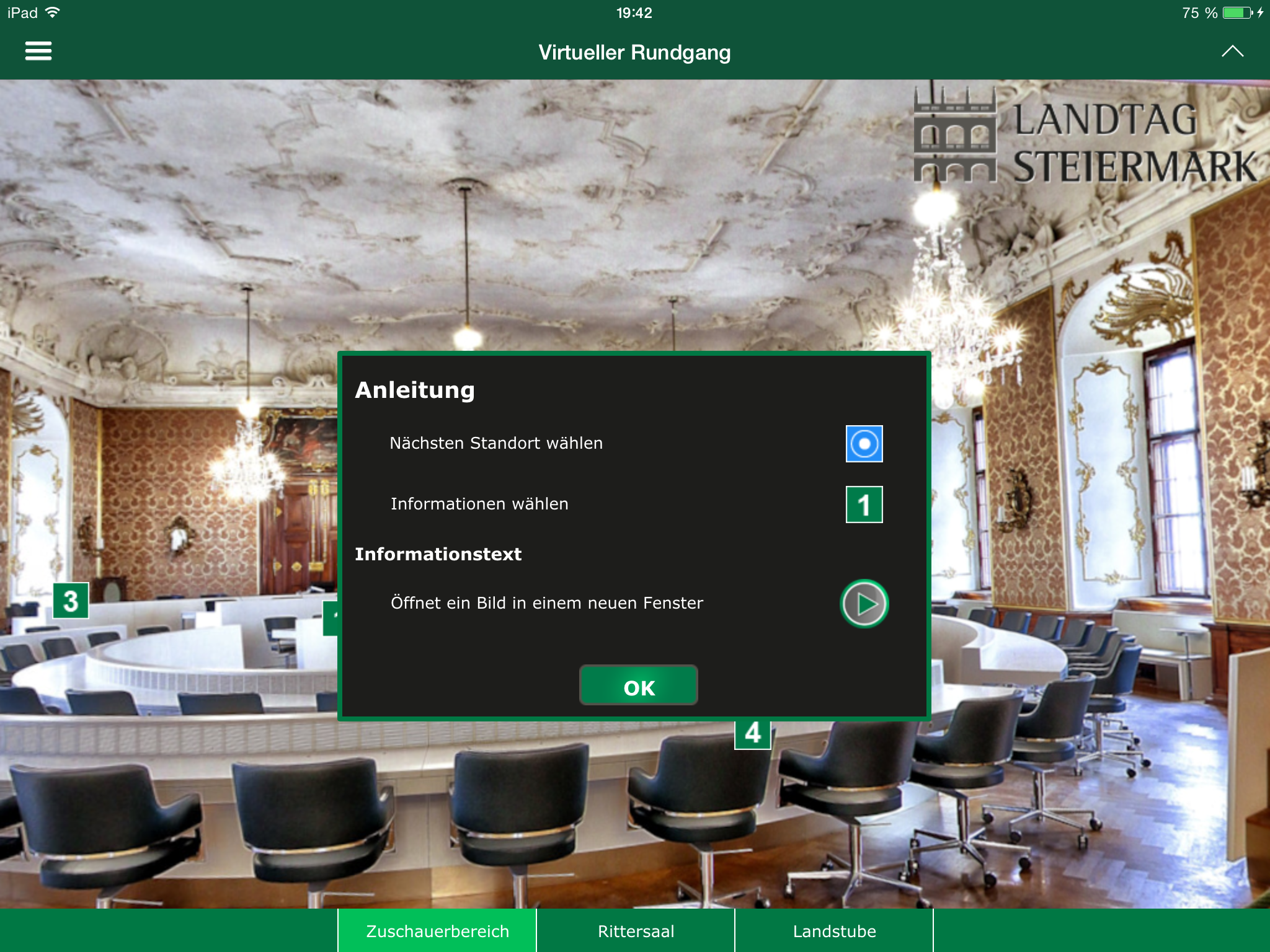 - Integration des vorhandenen interaktiven virtuellen Rundgangs durch Landstube und Rittersaal